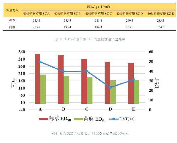 通過(guò)對(duì)480 g/L硝磺草酮懸浮體系制劑的研究,進(jìn)而測(cè)定5個(gè)不同制劑配方的3種稀釋濃度液的動(dòng)態(tài)表面張力,研究防治效果與動(dòng)態(tài)表面張力的關(guān)系。結(jié)果顯示無(wú)論對(duì)禾本科還是闊葉雜草,懸浮體系藥液的動(dòng)態(tài)表面張力的變化趨勢(shì),在一定程度上與其藥效正相關(guān)。