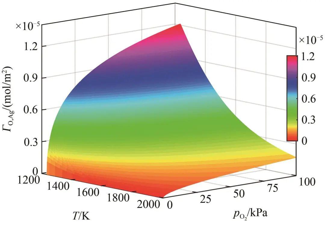 由圖7可知,當(dāng)溫度低于1500 K時(shí),ΓO,Ag隨氧氣壓力升高顯著增加;當(dāng)溫度高于1500 K時(shí),由于液態(tài)Ag-O系中的氧溶解度顯著降低,ΓO,Ag隨氧氣壓力的增加,其增加幅度減小。觀察圖8可知,η隨著溫度和氧分壓的升高而呈現(xiàn)下降趨勢。這是因?yàn)槭?27)中的表面偏析平衡系數(shù)KII與溫度呈負(fù)相關(guān),當(dāng)溫度升高時(shí)KII減小,導(dǎo)致表面氧濃度降低。此外,在較低的氧分壓條件下,O原子傾向富集于表面;當(dāng)氧分壓升高時(shí),更多的O原子溶入液態(tài)Ag-O系中,引起η減小。