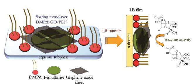 此外,將經(jīng)典兩親分子的Langmuir單層與酶結合是保持生物大分子催化性能的一種方式。F.A.SCHLL等研究了磷脂LB膜固定化青霉素酶(PEN),將GO加入青霉素酶‐脂質(zhì)Langmuir單層膜中,并作為LB膜轉移到固體載體上,評估了酶的催化性能(見圖3)。結果表明,GO作為由2,2‐二羥甲基丙酸(DMPA)和PEN組成的LB膜的添加劑,被固定在LB膜的PEN中;GO存在于酶脂LB膜中,不僅可以調(diào)節(jié)青霉素酶的催化活性,而且有助于數(shù)周后仍保持其酶活性。研究結果加強了混合納米結構薄膜的重要性,證明了使用由脂質(zhì)、GO和酶組成的LB膜應用于光學生物傳感器的可行性,對應用傳感器的生物電子設備研究具有重要意義。