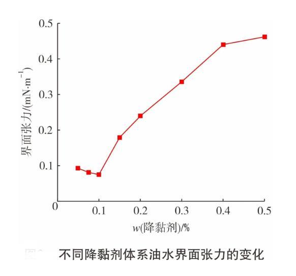 圖1為在不同降黏劑質(zhì)量分?jǐn)?shù)下,體系油水界面張力的變化情況。從圖1可知,在降黏劑質(zhì)量分?jǐn)?shù)為0.05%~0.10%時(shí),界面張力隨質(zhì)量分?jǐn)?shù)增加而降低。當(dāng)降黏劑質(zhì)量分?jǐn)?shù)超過(guò)0.10%時(shí),界面張力開(kāi)始上升。在低質(zhì)量分?jǐn)?shù)下,降黏劑在油水界面上形成吸附膜,降低界面張力。當(dāng)降黏劑質(zhì)量分?jǐn)?shù)超過(guò)臨界膠束含量后,降黏劑在界面聚集數(shù)量增加,吸附層排布更不規(guī)則,導(dǎo)致界面張力升高。