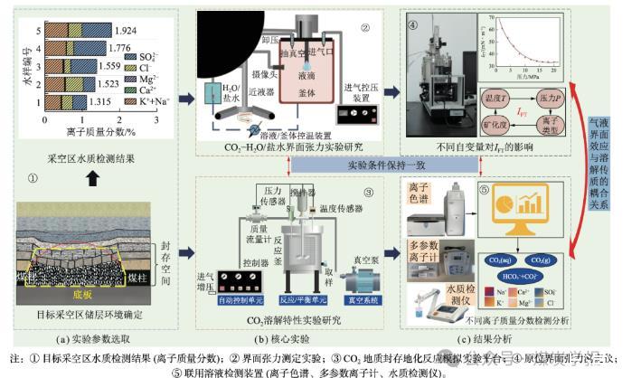 雖然前期探索CO2地下封存技術(shù)的方式較多,但多是基于CO2的超臨界態(tài)處理,對(duì)采空區(qū)儲(chǔ)層環(huán)境下氣態(tài)CO2氣液界面擴(kuò)散?溶解機(jī)理的探索有待進(jìn)一步分析。筆者利用原位界面張力測(cè)定儀開展了不同溫壓、地層水礦化度及陽離子溶液種類對(duì)CO2?地層水系統(tǒng)的IFT影響規(guī)律實(shí)驗(yàn),明晰了CO2注入含水碎脹煤巖體中的氣液界面擴(kuò)散效應(yīng),并將基于統(tǒng)計(jì)締合理論結(jié)合蘭納?瓊斯勢(shì)能模型的狀態(tài)方程(SAFT-LJ狀態(tài)方程)與密度梯度理論(DGT)結(jié)合預(yù)測(cè)了IFT理論值;其次利用自主研發(fā)的地質(zhì)封存地化反應(yīng)模擬實(shí)驗(yàn)平臺(tái)對(duì)相同條件下的CO2溶解性進(jìn)行了探究實(shí)驗(yàn),得到了采空區(qū)儲(chǔ)層環(huán)境下CO2溶解度變化特征,采用D-S模型計(jì)算了對(duì)應(yīng)CO2溶解度理論值,進(jìn)一步闡明了CO2?地層水界面效應(yīng)與溶解傳質(zhì)的耦合關(guān)系,以期為采空區(qū)CO2安全高效封存提供理論依據(jù)。