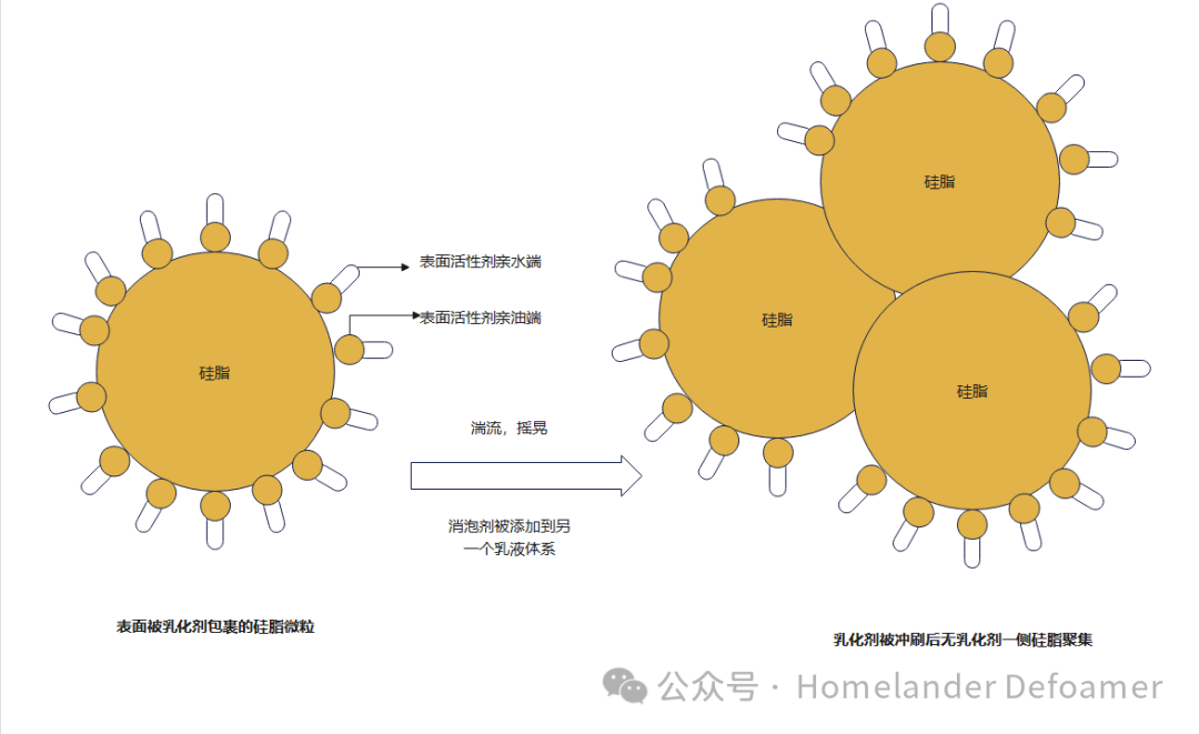 乳化劑既然很容易脫落,那么可以用化學(xué)鍵的方式,把乳化劑接枝在硅脂上,這樣即使析出,在沒有外加乳化劑和剪切力的情況下也能將析出的硅脂分散到體系中。這對親水基與親油基分子量的把控極其重要。若親水基太大,形成水包油的顆粒太小,雖然不析出。但是太小的微粒排液時(shí)間久,消泡速度就很慢。
