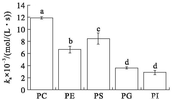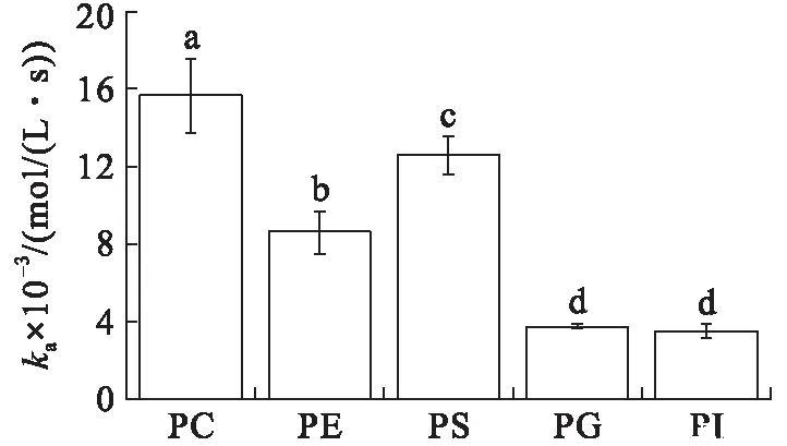 在初始表面壓力為25 mN/m的條件下(見圖4),VhPLD對PC的吸附常數(shù)最大((1.46±0.10)×104mol/(L·s)),對于PG((3.58±0.31)×103mol/(L·s))和PI((4.30±0.34)×103mol/(L·s))的吸附常數(shù)最小。在該初始表面壓力條件下,VhPLD對于PC、PE和PS的解離常數(shù)之間不存在顯著差異(P>0.05),該結(jié)果與在15 mN/m所測定的結(jié)果保持一致。而在該條件下獲得的VhPLD對不同磷脂單分子層吸附偏好性順序為PC>PS>PI>PE=PG。