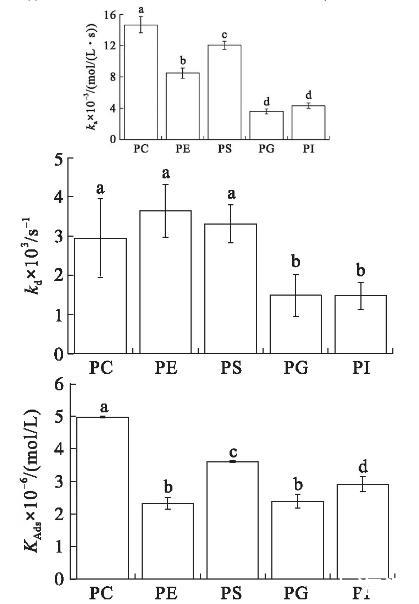 圖2初始表面壓力15 mN/m的條件下VhPLD對PC、PE、PS、PG和PI的吸附動力學參數(shù)