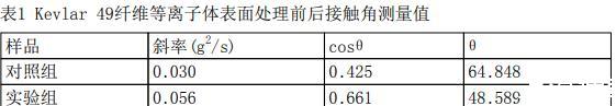 測量結(jié)果如下表所示,測量結(jié)果為三次平行樣的平均值??梢娊?jīng)等離子體表面處理后,芳綸纖維與水的表面接觸角降低16°,潤濕性提高。