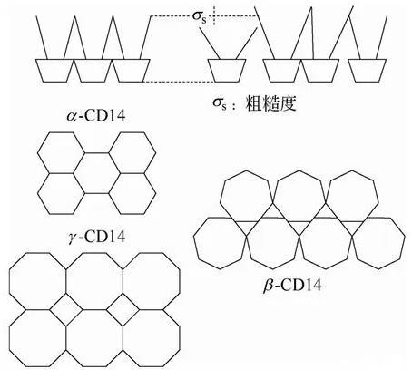 為了考察環(huán)糊精種類對所制備LB膜結(jié)構(gòu)的影響,Schalchli等用X-Ray反射技術(shù)對3種兩親性環(huán)糊精(α-、β-、γ-)在硅片上形成的LB單分子膜結(jié)構(gòu)進行了研究。結(jié)果顯示,所有兩親性環(huán)糊精都在基底上形成了單分子層,但兩親性α-和γ-環(huán)糊精LB膜的結(jié)構(gòu)相似,而β-環(huán)糊精LB膜的結(jié)構(gòu)與前兩者有很大的不同。并且兩親性β-環(huán)糊精LB膜的粗糙度也遠遠大于兩親性α-和γ-環(huán)糊精。以上不同的原因緣于β-環(huán)糊精的七邊形環(huán)不同于α-,γ-環(huán)糊精的六或八邊形環(huán)是對稱結(jié)構(gòu),從而不能像α-,γ-環(huán)糊精那樣在基底上形成有序的結(jié)構(gòu),如圖1所示。類似地,Alexandre等用掃描力顯微鏡(scanning force microscopy)考察了兩親性α-,β-,γ-全疊氮基環(huán)糊精在云母片上的LB膜的結(jié)構(gòu)。無論在納米尺度還是在微米尺度下觀察,β-全疊氮基環(huán)糊精勻呈現(xiàn)出不同的形貌。