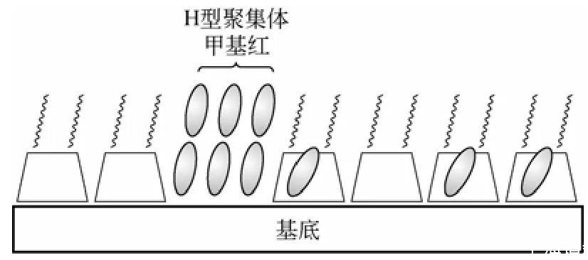 兩親性環(huán)糊精不僅能夠單獨組裝成LB膜,也能夠和其他有機分子共同組裝成雜化LB膜。Matsumoto課題組在兩親性環(huán)糊精和偶氮苯LB雜化膜方面做了大量的工作。因為偶氮苯化合物能夠在光照條件下發(fā)生可逆的順反光異構(gòu)反應,若將偶氮苯在固體基底上進行組裝將對光儲存、光轉(zhuǎn)換器件的發(fā)展具有十分重要的意義。但是由于在單純LB膜中,偶氮苯分子周圍自由體積很小,限制了順反光異構(gòu)反應的發(fā)生,而利用兩親性環(huán)糊精和偶氮苯雜化組裝成LB膜以解決這個問題。研究表明部分偶氮苯被包結(jié)在環(huán)糊精的空腔中,空腔為水溶性偶氮苯發(fā)生可逆的光異構(gòu)化反應提供了良好的場所。此外,環(huán)糊精疏水鏈段也能夠成為容納客體分子的場所,而且在膜中并非所有的環(huán)糊精分子都會包結(jié)偶氮苯分子,剩余的未包結(jié)環(huán)糊精為進一步功能化提供了基礎(chǔ)。但是在該雜化膜中會有部分偶氮苯分子形成的聚集體(圖2),所以進一步增加雜化分子的包結(jié)率和分散性是這一類雜化膜的研究方向。