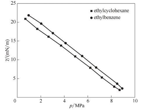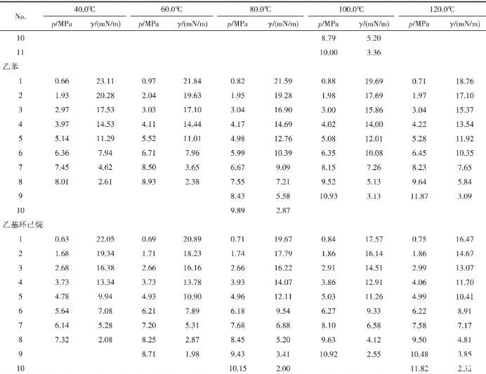 為探究相同碳原子數(shù)、不同結(jié)構(gòu)的影響,選取60℃下CO2-乙基環(huán)己烷/乙苯體系進(jìn)行比較。由圖7可以看出,兩種體系的界面張力下降趨勢(shì)基本相同,但CO2-乙苯的界面張力略高于CO2-乙基環(huán)己烷體系。姬澤敏等、Nagarajan等曾對(duì)CO2-苯/環(huán)己烷體系的界面張力進(jìn)行過測(cè)定,發(fā)現(xiàn)兩種體系界面張力隨壓力變化的等溫線幾乎重合,而CO2-乙基環(huán)己烷/乙苯體系界面張力差異明顯。從分子層面考慮,這是由于乙苯的極性比乙基環(huán)己烷大,從而導(dǎo)致乙苯分子間的相互作用更強(qiáng),處于界面層的乙苯分子更難擴(kuò)散到CO2中去,使得CO2-乙苯體系的界面張力大于CO2-乙基環(huán)己烷體系。