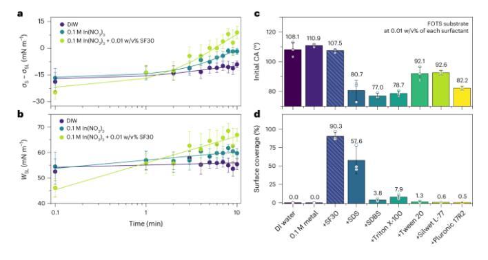 潤濕是液體在固體表面擴散以最小化自由能的現(xiàn)象,其效果通過界面張力和粘附功來定量評估。實驗顯示,添加SF30(煮沸30分鐘的絲蛋白)到水溶液中,盡管表面張力與對照組相似,但顯著降低了疏水性基底上的接觸角(CA),表明潤濕增強是由液固界面能的改變引起的,而非溶液表面能的變化(圖2a,b)。SF30通過多嵌段共聚物結構的多樣性有效調(diào)控界面能量,增強了潤濕效果,其水溶液在疏水性表面上的覆蓋率超過90%(圖2d)。與商用表面活性劑相比,SF30在控制疏水表面的潤濕性方面表現(xiàn)更優(yōu),即使這些表面活性劑能有效降低溶液的表面張力(圖2c)。