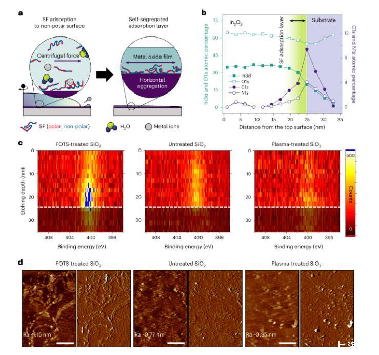 圖3a顯示了絲蛋白(SF)在不同表面能的基底上的吸附機制,假設疏水結構域與非極性表面相互作用,而親水結構域則面向溶液。作者通過X射線光電子能譜(XPS)和原子力顯微鏡(AFM)分析了摻有不同濃度SF的溶液在不同表面上的表現(xiàn)。XPS結果顯示,在非極性基底上,高濃度SF溶液形成了含有蛋白質的薄膜,并且在高能離子轟擊下薄膜和基底界面上仍保留有N1s信號(圖3b,c)。AFM分析則揭示了不同基底上的表面拓撲結構,非極性基底上呈現(xiàn)平躺形狀,而極性基底上則顯示島狀聚集體(圖3d)。研究表明,SF的吸附效率受表面能和分子量影響,并可有效增強潤濕性。這一適應性吸附機制有助于在不同表面上快速形成高質量金屬氧化物薄膜,無需調(diào)整沉積參數(shù)。