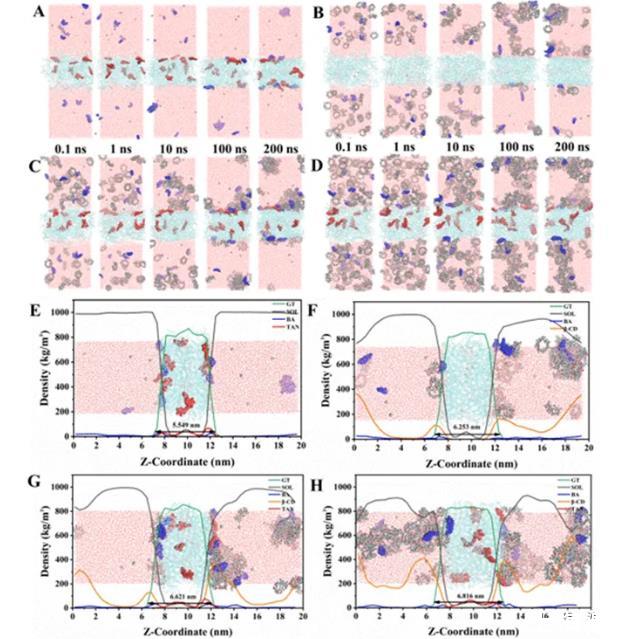 界面層厚度受分子種類、結(jié)構(gòu)及密度影響顯著。實(shí)驗(yàn)表明,實(shí)驗(yàn)組尤其是實(shí)驗(yàn)2中油相增厚,可能是由于TAN在油水界面與膽鹽和β-CD發(fā)生相互作用。該現(xiàn)象說(shuō)明β-CD與TAN之間的相互作用不僅促進(jìn)了TAN向界面遷移,還揭示了BS或β-CD對(duì)TAN的吸附能力。實(shí)驗(yàn)組界面β-CD密度提升,說(shuō)明β-CD與TAN相互吸引。動(dòng)力學(xué)模擬結(jié)果表明β-CD先與TAN結(jié)合于界面,誘導(dǎo)膽鹽圍繞此復(fù)合物聚集,系統(tǒng)能量漸趨穩(wěn)定。最終,TAN主要錨定于由膽鹽與環(huán)糊精構(gòu)筑的界面團(tuán)聚體上,增強(qiáng)環(huán)糊精對(duì)膽鹽的親和力,導(dǎo)致環(huán)糊精與膽鹽組裝形成更大的聚集體,從而增加界面厚度。
