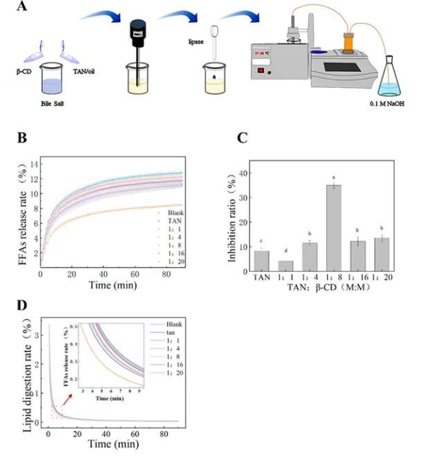 β-CD與TAN協(xié)同作用顯著減少NaOH消耗,抑制脂質(zhì)消化。脂質(zhì)消化程度受到抑制,抑制程度與β-CD添加量無(wú)關(guān)。當(dāng)TAN與β-CD的摩爾比為1:8時(shí),抑制脂質(zhì)消化的效果最佳,抑制率為34.92%。這可能是因?yàn)閮烧咴诮缑嫔献越M裝,增強(qiáng)了界面活性。β-CD與疏水物質(zhì)形成的復(fù)合物可以通過(guò)氫鍵在油水界面上組裝形成致密網(wǎng)絡(luò),顯著增強(qiáng)界面穩(wěn)定性,限制脂肪酶在界面區(qū)域的吸附,從而抑制脂質(zhì)消化。在消化的后期階段,物質(zhì)在液滴間的置換達(dá)到平衡,從而在界面處產(chǎn)生恒定和動(dòng)態(tài)的可吸附區(qū)域。此時(shí),消化速率變化不大,游離脂肪酸的釋放和解吸速率保持相對(duì)恒定。