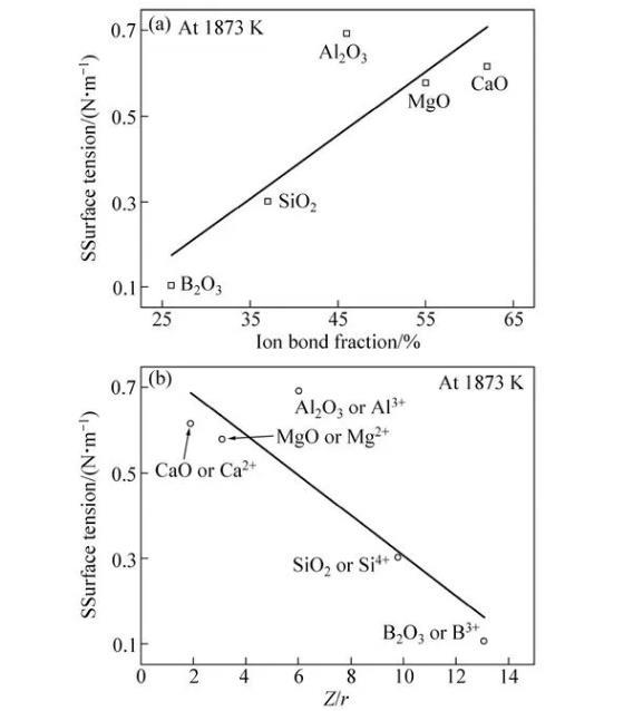 純氧化物表面張力主要與離子間的鍵能有關(guān),形成氧化物的離子的靜電勢(Z/r)大,且離子鍵分數(shù)高的氧化物有較大的表面張力。純組分氧化物的靜電勢和離子鍵分數(shù)如圖3所示。純液態(tài)B2O3屬于表面活性物質(zhì),在1873 K時的表面張力約為0.104 N/m,僅為MgO、CaO、Al2O3和SiO2同溫度純物質(zhì)表面張力數(shù)據(jù)的1/6~1/3。Si4+和B3+離子雖然靜電勢很高,但其離子鍵分數(shù)較低(<50%),易形成共價鍵高、靜電勢小的絡離子,從而其表面張力值較?。籑g2+、Ca2+和Al3+離子雖然靜電勢較小,但離子鍵分數(shù)較高,從而具有較高的表面張力值。