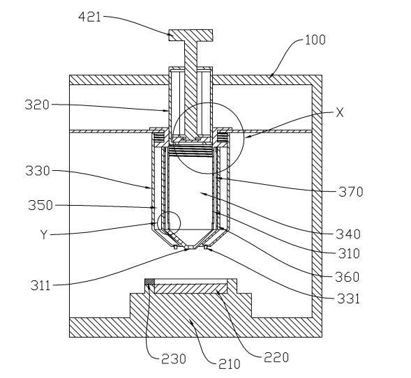 副筒320和滴液筒310之間限定出滴液腔340,滴液筒310上開設(shè)有出液口311,滴液腔340與出液口311連通。涂片臺200安裝于外殼100上,出液口311和涂片臺200在第一方向上依次設(shè)置,且當(dāng)出液口311滴出一個待檢測液的液滴時,液滴沿第一方向上靠近涂片臺200的一端能夠與涂片臺200接觸。外筒330上具有第一空腔350,外筒330上開設(shè)有進(jìn)氣口331,進(jìn)氣口331設(shè)置在出液口311外側(cè),進(jìn)氣口331與第一空腔350連通。滴液筒310繞第一方向轉(zhuǎn)動能夠分別促使副筒320和外筒330沿第一方向移動,且在進(jìn)行滴液操作時,副筒320沿第一方向移動能夠使滴液腔340體積變小,外筒330沿第一方向移動能夠使第一空腔350體積變大。