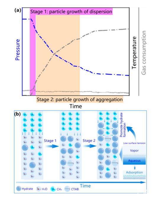 結(jié)合微觀與宏觀尺度的實驗結(jié)果,該研究總結(jié)出兩階段水合物生長模式——第一階段為顆粒分散生長過程、第二階段為顆粒聚集生長過程(圖2)。