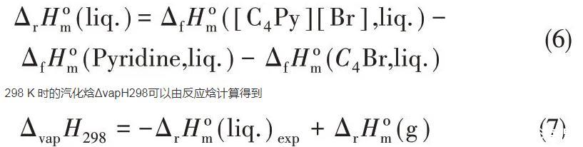 在化學(xué)反應(yīng)過程中出現(xiàn)的DSC峰面積是反應(yīng)焓的量度。根據(jù)Hess定律,反應(yīng)焓ΔrH定義為產(chǎn)物和反應(yīng)物的生成焓ΔfH的差值,例如,對于反應(yīng)Pyridine(liq.)+C4Br(liq.)=[C4Py][Br](liq.),有