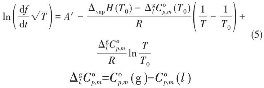 Verevkin等[54]開發(fā)了評估程序的物理基礎(chǔ),并使用1-乙基-3-甲基咪唑雙(三氟甲磺?;?酰亞胺[C2mim][Tf2N]進(jìn)行測量,從而將蒸發(fā)焓的測量范圍降低到363 K。和文獻(xiàn)中已有的數(shù)據(jù)相比較,具有一致性。這項工作中開發(fā)的方法也為得到ILs的汽化焓開辟了一條新途徑。經(jīng)過一系列公式推導(dǎo),構(gòu)建了ILs的摩爾汽化焓、頻率損耗率df/dt和溫度的關(guān)系