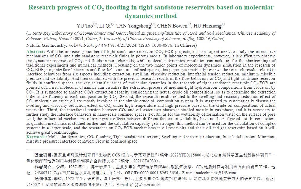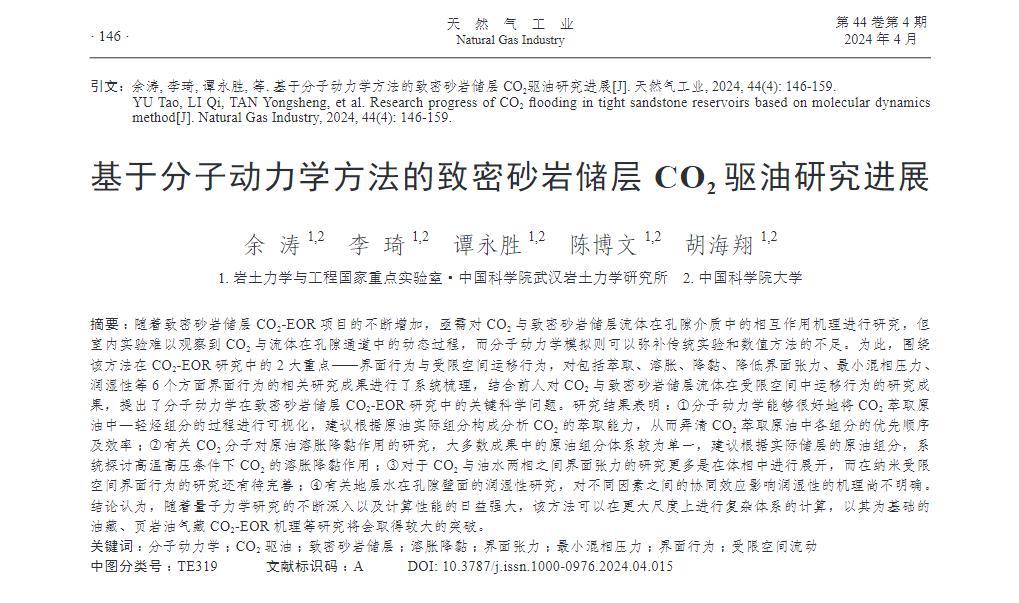 隨著致密砂巖儲(chǔ)層CO2-EOR項(xiàng)目的不斷增加,亟需對CO2與致密砂巖儲(chǔ)層流體在孔隙介質(zhì)中的相互作用機(jī)理進(jìn)行研究,但室內(nèi)實(shí)驗(yàn)難以觀察到CO2與流體在孔隙通道中的動(dòng)態(tài)過程,而分子動(dòng)力學(xué)模擬則可以彌補(bǔ)傳統(tǒng)實(shí)驗(yàn)和數(shù)值方法的不足。為此,圍繞該方法在CO2-EOR研究中的2大重點(diǎn)——界面行為與受限空間運(yùn)移行為,對包括萃取、溶脹、降黏、降低界面張力、最小混相壓力、潤濕性等6個(gè)方面界面行為的相關(guān)研究成果進(jìn)行了系統(tǒng)梳理,結(jié)合前人對CO2與致密砂巖儲(chǔ)層流體在受限空間中運(yùn)移行為的研究成果,提出了分子動(dòng)力學(xué)在致密砂巖儲(chǔ)層CO2-EOR研究中的關(guān)鍵科學(xué)問題。