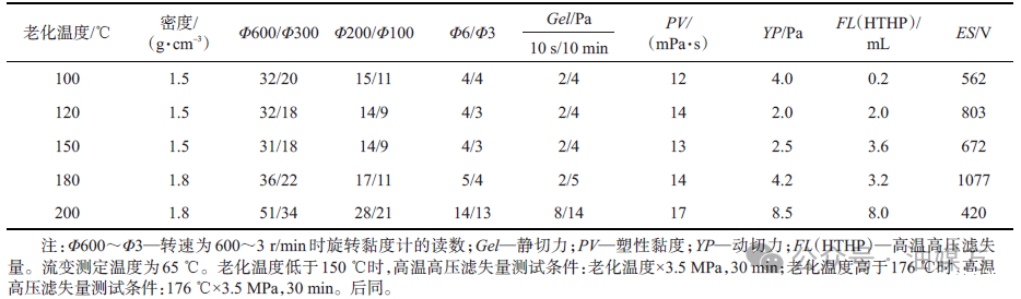 利用重晶石對鉆井液的密度進行調(diào)節(jié),評價不同密度條件下體系的綜合性能,結(jié)果見表3。由表3可見,構(gòu)建的環(huán)保非水基鉆井液在120~180℃范圍內(nèi)具有較好的穩(wěn)定性,密度為1.8g/cm3時,鉆井液體系破乳電壓在1000V以上,體系具有良好的流變性及高溫高壓濾失量。但是當(dāng)老化溫度高于200℃后,鉆井液的黏度明顯增加,高溫高壓濾失量變大。這可能是因為BIO-EMUL與BIO-COAT屬于脂肪酸及其酯類衍生物表面活性劑,高溫造成了表面活性劑的降解及油/水界面的解吸附。