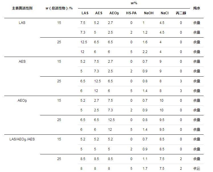 由前文可知,不同表面活性劑在膠束形態(tài)、增稠、去污等多個(gè)方面均有不同表現(xiàn)。對(duì)于結(jié)構(gòu)型洗滌劑,考察不同主表面活性劑的區(qū)別,同時(shí)探究了HS-PA在形成結(jié)構(gòu)型洗滌劑中發(fā)揮的作用。與增稠性能類似,不同配方體系形成結(jié)構(gòu)型洗滌劑所需添加的鹽量也不同。因此,在設(shè)計(jì)配方時(shí),只要求同組的實(shí)驗(yàn)樣品(含HS-PA)和空白樣品(不含HS-PA)的鹽量相同(制備樣品時(shí),以鹽量加至空白組出現(xiàn)剪切變稀的現(xiàn)象為準(zhǔn)),具體配方如表2所示(表中LAS、AES已換算為純質(zhì)量分?jǐn)?shù),HS-PA(w=30%)未換算)。