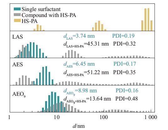 為了探究高分子表面活性劑在水溶液中聚集行為,考察了常規(guī)表面活性劑與HS-PA復(fù)配前后的膠束粒徑變化。由圖3的結(jié)果可知,3種低分子量表面活性劑的聚集體尺寸及分布情況比較相似,其粒徑均小于10 nm,呈現(xiàn)出單峰分布。LAS、AES和AEO9的平均膠束粒徑分別為3.74,6.45和8.98 nm。PDI越大,說明其粒徑分布越寬,高分子表面活性劑HS-PA的PDI大于0.5,其粒徑情況不適合用平均粒徑值表示,因此未在圖中提供平均粒徑的數(shù)據(jù)。從圖3中HS-PA的粒徑分布情況可以看出,其聚集體為多峰分布,且分布較寬。粒徑為3~5 nm的聚集體可能是HS-PA的單分子膠束。與低分子量表面活性劑不同,在稀溶液中,高分子表面活性劑結(jié)構(gòu)中的疏水鏈段傾向于聚集,分子卷縮,可自身形成單分子膠束,該現(xiàn)象曾被許多研究報(bào)道。粒徑為50~110 nm以及650~1 000 nm的為HS-PA的有序多分子聚集體,如膠束、小囊泡等。HS-PA分子量大,分子中的疏水鏈段和親水鏈段長(zhǎng),導(dǎo)致其有序多分子聚集體的粒徑明顯比低分子量表面活性劑大。