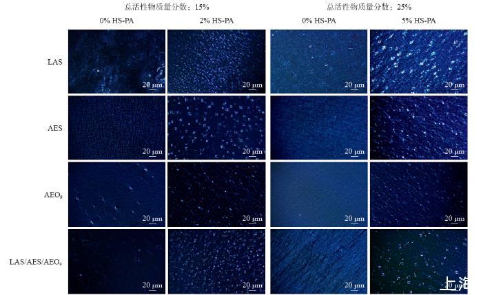 圖5為結(jié)構(gòu)型洗滌劑的偏光紋理圖(表2中的配方,以“主表面活性劑—總活性物質(zhì)量分?jǐn)?shù)—HS-PA質(zhì)量分?jǐn)?shù)”區(qū)分)。從圖中可以明顯看出,在分別以LAS、AES和AEO9為主表面活性劑的配方中,當(dāng)總活性物質(zhì)量分?jǐn)?shù)約為15%或者25%時(shí),加入HS-PA后,偏光圖像中的馬耳他十字液晶形狀均明顯增多。馬耳他十字是球形層狀液晶的典型織構(gòu),說明了HS-PA的加入有利于體系形成球形層狀液晶。當(dāng)體系中不含HS-PA時(shí),偏光視野并非完全暗場(chǎng),而是有微弱的油狀條紋或者少量的馬耳他十字,表明其中也具有部分平面或者球形層狀液晶結(jié)構(gòu),但液晶較弱。不同主表面活性劑的層狀液晶結(jié)構(gòu)存在一些區(qū)別,AEO9為主表面活性劑的配方,其十字花紋理直徑為2~3μm,小于LAS、AES以及三元表面活性劑平衡體系的十字花紋理直徑(7~10μm)。以上結(jié)果與HS-PA復(fù)配體系中的粒徑分布變化相吻合:當(dāng)HS-PA與低分子量表面活性劑復(fù)配時(shí),LAS/AES與HS-PA的混合膠束粒徑明顯變大,但AEO9與HS-PA的混合膠束粒徑只略微變大。根據(jù)球形層狀液晶的結(jié)構(gòu)可知,其內(nèi)部混合膠束粒徑越大,則相應(yīng)的液晶粒徑越大。對(duì)于除AEO9外的其他3種體系而言,總活性物質(zhì)量分?jǐn)?shù)從15%提高到25%,HS-PA加量從2%增加至5%,球形層狀液晶的粒徑會(huì)相應(yīng)增大,此現(xiàn)象在LAS為主表面活性劑以及LAS較多的三元表面活性劑平衡體系中更為明顯。
