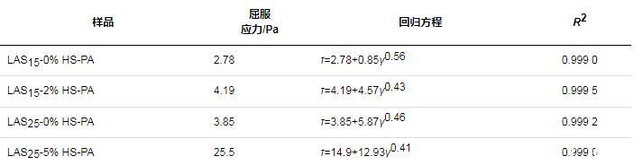 根據(jù)Herschel-Bulkley模型擬合的回歸方程及流變參數(shù)如表5所示(命名規(guī)則:主表面活性劑總活性物質(zhì)量分?jǐn)?shù)-HS-PA用量),其中擬合曲線相關(guān)系數(shù)(R2)均不小于0.999,相關(guān)性較高,表明LAS體系的流變性可以利用Herschel-Bulkley模型進(jìn)行研究。在活性物質(zhì)量分?jǐn)?shù)為15%的體系中添加2%HS-PA,屈服應(yīng)力從原先的2.78 Pa提高至4.19 Pa,在25%活性物配方中加入5%HS-PA,屈服應(yīng)力由3.85 Pa提高至25.5 Pa,說明HS-PA的添加可以提高體系的屈服應(yīng)力。屈服應(yīng)力是指液晶結(jié)構(gòu)破壞時(shí)的臨界剪切應(yīng)力值。由前文研究結(jié)果可知,HS-PA的加入使配方獲得更多更致密的球形層狀液晶,因此,相應(yīng)地,體系屈服應(yīng)力也越大。而屈服應(yīng)力越大,當(dāng)體系中包含水不溶粒子(如微膠囊)時(shí)越容易穩(wěn)定,該結(jié)果與離心測(cè)試結(jié)果相契合。