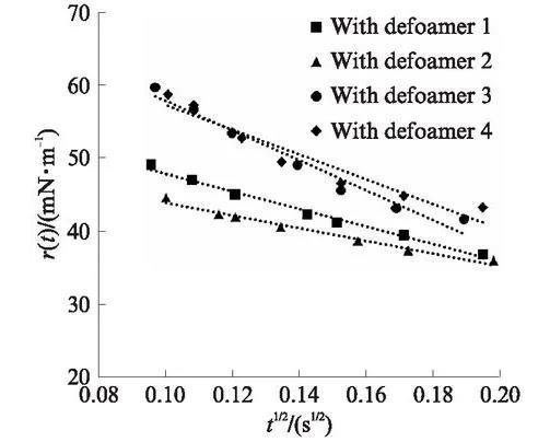 圖2是截取圖1中極短時(shí)間的動態(tài)表面張力γ(t)與極短時(shí)間范圍t1/2的關(guān)系圖。由圖2可知:消泡劑的動態(tài)表面張力與時(shí)間的平方根呈線性關(guān)系,說明消泡劑在起泡液中極短時(shí)間范圍內(nèi),整個(gè)吸附過程由擴(kuò)散控制。