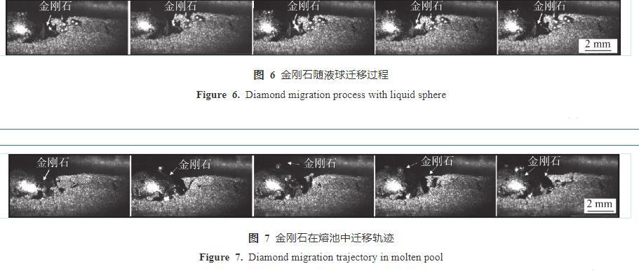 圖6所示為金剛石在液態(tài)球上的運動軌跡。隨著激光熱作用,釬料首先熔化成小液滴,然后匯聚成小球,由圖6可以看出,金剛石在液態(tài)小球上不穩(wěn)定的運動,以致可以見到金剛石表面亮度很高的閃光,這是金剛石反射的激光。圖7是激光釬涂過程中,金剛石在釬涂熔池中的運動路徑。金剛石顆粒首先存在于熔池邊緣底部,隨著釬涂過程的進行,金剛石顆粒沿熔體球面逐漸向上部運動,然后在熔池表面向后方移動,當激光熱源遠離,熔池開始凝固,金剛石顆粒被固結(jié)于涂層近表面位置,保持一定的出刃高度,有利于發(fā)揮耐磨作用。金剛石運動總趨勢是沿液態(tài)球表面或熔池邊緣向液/氣界面遷移。