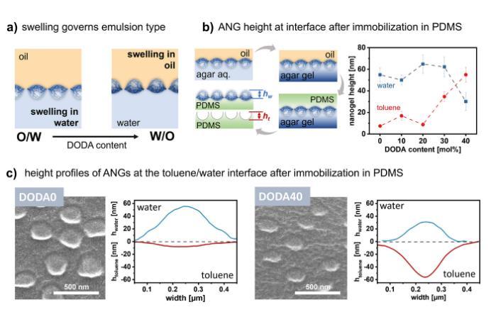 圖1展示了制備兩親性納米凝膠(ANG)的合成方案,以及不同ANG的性質(zhì)。通過在反應(yīng)性前體顆粒上功能化混合親水(HPA)和親油(DODA)胺,制備了具有不同網(wǎng)絡(luò)疏水性的ANG(圖1a)。動態(tài)光散射(DLS)數(shù)據(jù)顯示了不同ANG的流體動力學(xué)直徑,證明ANG保持了相似的膠體性質(zhì)(圖1b)。非交聯(lián)DODA0至DODA40聚合物膜的接觸角表明,ANG的疏水性隨著DODA含量的增加而增加(圖1d)。綜上所述,圖1展示了通過后功能化反應(yīng),成功制備了具有可調(diào)網(wǎng)絡(luò)疏水性但保持相似膠體性質(zhì)的兩親性納米凝膠庫,為系統(tǒng)研究網(wǎng)絡(luò)疏水性對乳液穩(wěn)定性的影響提供了基礎(chǔ)。
