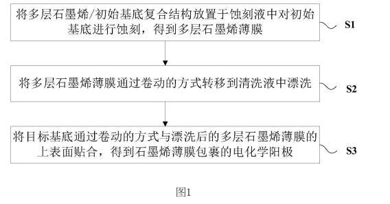 步驟3、將目標(biāo)基底通過(guò)卷動(dòng)的方式與漂洗后的多層石墨烯薄膜的上表面貼合,得到石墨烯薄膜包裹的電化學(xué)陽(yáng)極在一些實(shí)施例中,目標(biāo)基底可選用鋅或鋁,用這兩種金屬制備陽(yáng)極,均可以取消導(dǎo)電劑的使用,增大活性物質(zhì)的密度,進(jìn)而增加電池整體的能量密度。