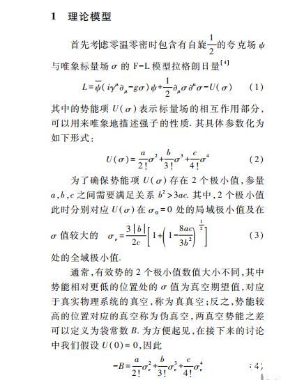本文具體采用的模型是具有夸克禁閉性質(zhì)的Friedberg-Lee模型(F-L Model)。F-L模型最初用于描述低能時強子的行為,將強子看做真空中的袋狀孤子解,為QCD理論中的禁閉行為提供了非常直觀的物理解釋。不僅如此,該模型也被擴展至有限溫度密度下夸克物質(zhì)的退禁閉相變的研究,提供了研究夸克強子相變性質(zhì)的有利手段。但是該模型只能給出有限溫度密度下夸克物質(zhì)一級相變的結(jié)果,無法討論平滑過渡(Crossover)相變和相臨界截點相關的物理問題,具有一定局限性。不過本文主要研究夸克強子一級相變下氣泡或液滴的動力學問題,F(xiàn)-L模型是比較合適的模型。