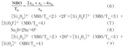 熔體表面張力與熔渣結(jié)構(gòu)的聚合程度密切相關(guān)。連鑄結(jié)晶器保護渣屬于硅酸鹽,硅酸鹽熔體中含有不同聚合程度的硅氧陰離子團。熔渣結(jié)構(gòu)的聚合程度用符號“NBO/TSi”表示,其計算公式如式(4)所示。NBO/TSi值越小,說明熔體聚合程度越高。將預熔渣和靜滴法測定后的渣樣成分分別帶入到式(6)中,計算結(jié)果如表2所示。從表中可以看出,靜滴法測定后渣樣的NBO/TSi值小于預熔渣的NBO/TSi值,說明靜滴法測定后的渣樣熔體結(jié)構(gòu)聚合程度高于預熔渣熔體結(jié)構(gòu)聚合程度。這是由于F-能降低熔渣結(jié)構(gòu)的聚合程度,將高聚合程度的硅氧陰離子團逐漸解聚成低聚合程度的硅氧陰離子,同時Na2O電解出O2-,O2-的出現(xiàn)亦可降低熔體的聚合程度,反應(yīng)式見(7)~(9):
