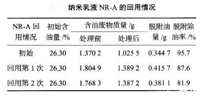 將已處理過含油廢物的納米乳液分離后進行收集,然后進行重復(fù)處理新的含油廢物。納米乳液和含油廢物按劑固比2∶1混合后,用磁力攪拌器在1 000 r/min下攪拌20 min,實驗溫度為25℃,測量含油廢物經(jīng)不同回用次數(shù)的納米乳液脫附處理前后的含油量,計算脫附除油率,測試結(jié)果見下表。