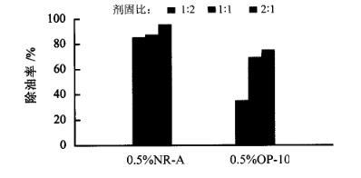 從圖2的脫附除油率來看,當(dāng)納米乳液濃度在0.5%時,除油效果最佳,脫附除油率達到95.7%;當(dāng)納米乳液濃度達到5%時,脫附除油下降一半,說明濃度過高的納米乳液反而降低了它的脫附除油效果;在低濃度下(0~1%),納米乳液和含油廢物按劑固比為2∶1處理含油廢物時,脫附效果優(yōu)于劑固比為1∶1的脫附效果。將0.5%的納米乳液NR-A與同濃度下的OP-10進行脫附除油對比,實驗結(jié)果如圖3所示。從圖3的脫附除油率可以看出,當(dāng)劑固比為1∶2時,納米乳液NR-A的脫附除油率(85.49%)是OP-10(34.73%)的2倍多;當(dāng)劑固比達到2∶1時,納米乳液NR-A的脫附除油率(95.74%)仍比OP-10(74.1%)高出20%。由此說明納米乳液NR-A的脫附除油效果遠(yuǎn)遠(yuǎn)超過常規(guī)表面活性劑。