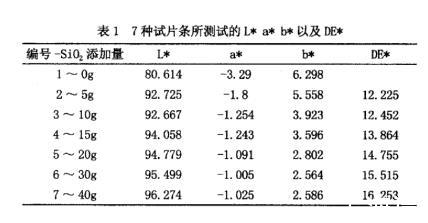 由表1可以看出,選擇沒用添加二氧化鈦的高溫尼龍HTN即1~0g做為標(biāo)準(zhǔn)樣,并測試其L*,a*,b*數(shù)值,2~5g,3~10g,4~15g,5~20g,6~30g,7~40g做為比較樣。從數(shù)據(jù)上進(jìn)行比較,隨著添加量的增加,2號(hào)~7號(hào)色差DE*逐漸增加,即試樣表現(xiàn)得越來越白,2號(hào)~3號(hào)添加量增加5g,雖然L*值變化不明顯,但是b*值變化還是蠻大的,此比例不能說明添加量已經(jīng)達(dá)到飽和狀態(tài)。4號(hào)~5號(hào)添加量增加5g,L*數(shù)值變化0.7,5號(hào)~6號(hào)隨著添加量繼續(xù)增加10g,L*數(shù)值只變化0.7,說明隨著二氧化鈦添加量的增加,體系所表現(xiàn)的顏色趨于飽和。