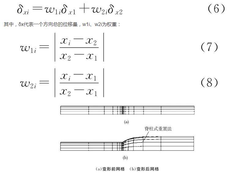 在數(shù)值模擬時(shí),熔體自由表面在模擬的過程中會(huì)發(fā)生變形,自由表面的網(wǎng)格會(huì)因?yàn)樽杂杀砻嫖恢玫淖兓l(fā)生變化。此時(shí),需要采用網(wǎng)格重置技術(shù)。網(wǎng)格重置可以根據(jù)邊界點(diǎn)的位置的變化重新定位內(nèi)部網(wǎng)格節(jié)點(diǎn)。Spine法是一種比較簡(jiǎn)單,適用于二維擠出成型的網(wǎng)格重置方法。其網(wǎng)格節(jié)點(diǎn)是沿著線性進(jìn)行重新組織的,如圖3所示。節(jié)點(diǎn)的位置確定是按照一維方式進(jìn)行邏輯排列的,這就像是對(duì)二維平面進(jìn)行切片,切片的方式是沿著自由表面或者移動(dòng)邊界的法向方向,從而得到最終的網(wǎng)格。Spine法是線性組織的,并且在每個(gè)線段的端點(diǎn)處都有相應(yīng)的節(jié)點(diǎn)。假設(shè)x1、x2是線段的2個(gè)端點(diǎn)。按照Spine法的規(guī)則,內(nèi)部節(jié)點(diǎn)的位移數(shù)學(xué)表達(dá)式為: