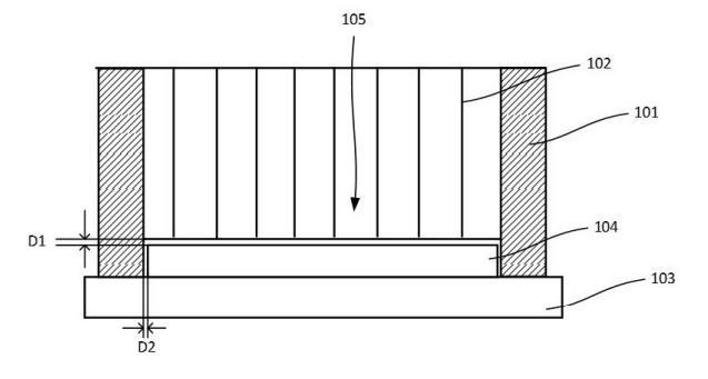 如圖1所示,在一個實施例中,所述筒壁101的材質(zhì)可以為聚合物、陶瓷、金屬等耐腐蝕的材料,所述筒壁101的形狀例如可以為圓柱狀,所述筒壁101的徑向?qū)挾却笥谒鼍A104的徑向?qū)挾?,所述筒?01套設(shè)于晶圓104外圍時,所述筒壁101與所述晶圓104邊緣之間的間距D2為30微米~500微米,如100微米、200微米、300微米等,以避免套設(shè)時碰撞晶圓104而造成晶圓104或筒壁101的損傷。