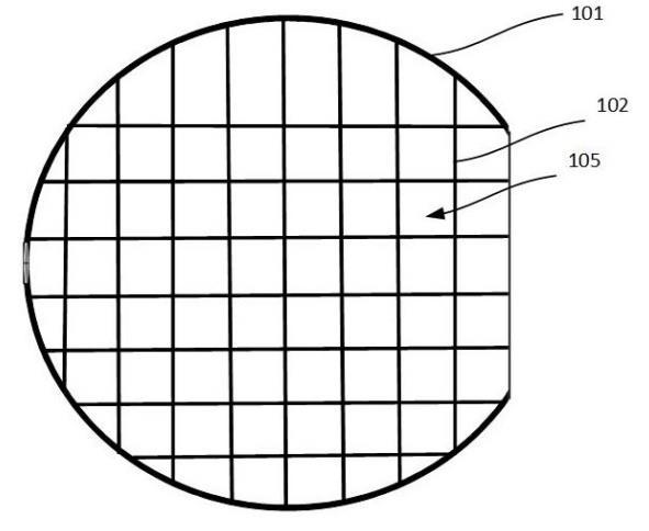 如圖1~圖2所示,本實施例提供一種用于晶圓104分區(qū)腐蝕的隔離網(wǎng)筒,所述隔離網(wǎng)筒包括:筒壁101,用于套設(shè)于晶圓104外圍,并與所述晶圓104共同被真空吸附臺103吸附固定;隔離網(wǎng)壁102,固定于所述筒壁101內(nèi),用于將晶圓104表面分隔成多個相互獨立的腐蝕區(qū)域105,當(dāng)所述筒壁101被真空吸附臺103固定時,所述隔離網(wǎng)壁102延伸至晶圓104表面上方,并與晶圓104表面具有間距以形成非接觸氣隙,所述非接觸氣隙被配置為當(dāng)腐蝕液進入某一個腐蝕區(qū)域105時,基于液體表面張力使得腐蝕液不會進入到與該腐蝕區(qū)域105相鄰的另一個腐蝕區(qū)域105。