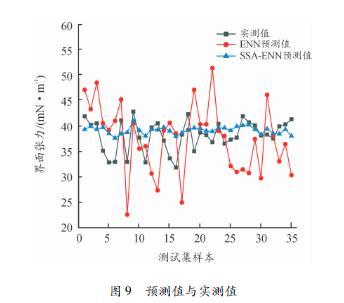 圖9給出了以140組樣本為訓(xùn)練集對(duì)ENN和SSAENN預(yù)測(cè)模型進(jìn)行訓(xùn)練后,其余未參加訓(xùn)練的35組樣本的界面張力預(yù)測(cè)值。與測(cè)試集的界面張力實(shí)測(cè)值相比,ENN預(yù)測(cè)模型的預(yù)測(cè)值整體差值較大,預(yù)測(cè)差值最大為14.58mN/m,最小為1.38mN/m;SSAENN預(yù)測(cè)模型的整體預(yù)測(cè)差值較小,個(gè)別變壓器油測(cè)試樣本的預(yù)測(cè)差值較大,預(yù)測(cè)差值最大為6.08mN/m.