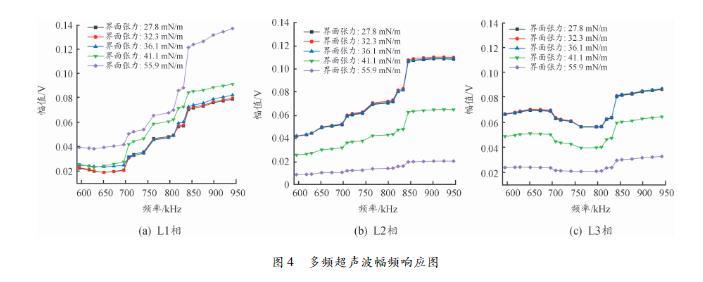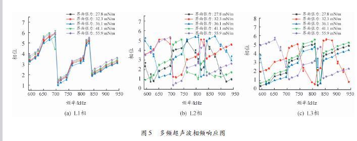 這是由于2個(gè)超聲波接收器所接收到的三相超聲波信號(hào)傳播所經(jīng)過的路徑和周期不同,導(dǎo)致對(duì)應(yīng)的相角不同。L2和L3的相頻響應(yīng)圖變化趨勢(shì)無(wú)相對(duì)明顯的變化規(guī)律,但超聲波信號(hào)在傳播過程中由于發(fā)生超聲弛豫、吸收、散射等現(xiàn)象導(dǎo)致相角的不同,其信息包含在相位頻譜中,對(duì)于分析變壓器油界面張力具有重要作用。