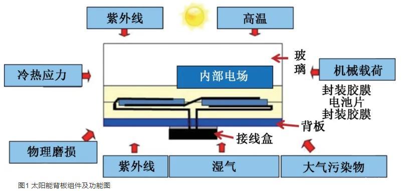 太陽(yáng)能光伏背板位于光伏組件的背面,是光伏組件的重要組成部分,而背板作為直接與外部環(huán)境大面積接觸的光伏封裝材料,必須具備卓越的耐老化(濕熱、干熱、紫外)、耐電氣絕緣、水蒸氣阻隔、尺寸穩(wěn)定等性能,為組件在各自長(zhǎng)期惡劣環(huán)境下提供絕緣保護(hù)和支撐作用,如圖1所示。