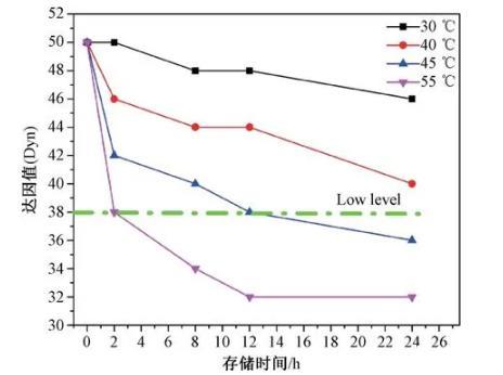 電暈后30℃存儲24 h后,耐候?qū)舆_因值為46 mN/m;當升高存儲溫度至45℃時,12 h后達因值即降低到38 mN/m;當存儲溫度為55℃時,達因值衰減更為迅速,2 h后達因值降為38 mN/m。耐候?qū)舆_因值隨著熟化溫度的升高,達因值衰減速率逐漸增大,因此若控制在38 mN/m以上,熟化溫度不能高于40℃,如圖3所示。