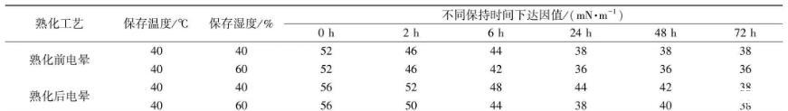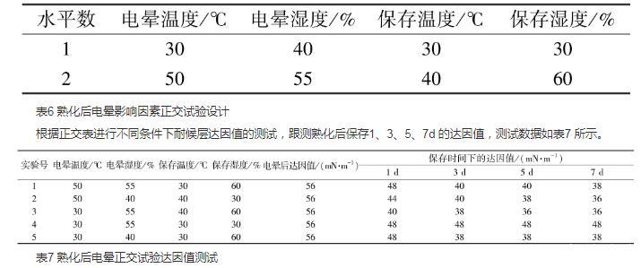本文通過JMP軟件定制熟化前后電暈正交試驗設計,發(fā)現(xiàn)熟化溫度影響最顯著,熟化環(huán)境的濕度對耐候?qū)颖砻鎻埩τ绊懙诙@著,反應程度第三顯著,電暈溫度無明顯影響。在40℃條件下,對熟化濕度進行單因素分析,控制熟化濕度低于40%,基本上能使耐候?qū)颖砻鎻埩_到38 mN/m。熟化后電暈與熟化前電暈相比,在相同的保存時間內(nèi),熟化后電暈達因值較大。