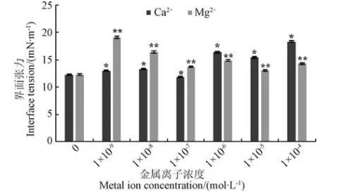 二價金屬子Ca2+、Mg2+對油水界面張力的影響見圖4。由圖可知,低濃度時,Ca2+對油水界面張力的影響較??;當(dāng)Ca2+濃度達(dá)到1.00×10-4mol/L時,界面張力驟然增至18.3 mN/m;而Mg2+對界面張力的影響與Ca2+有相反的趨勢,呈現(xiàn)低濃度促進(jìn),高濃度抑制的現(xiàn)象,該結(jié)果與于立軍等的研究結(jié)果一致。原因在于在所試驗溫度的油水界面上,Ca2+和Mg2+形成不溶物的濃度明顯不同,對油水界面張力產(chǎn)生影響的濃度范圍也不同。