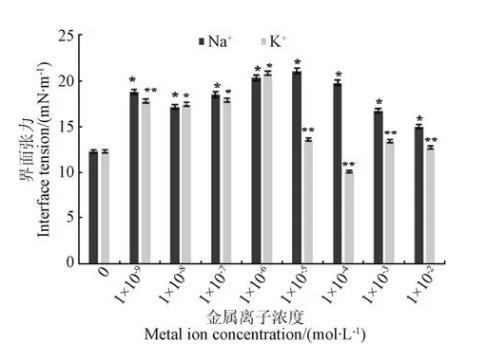 圖2 NaCl及KCl對麥胚LA濃度為1.7×10-6mol/L的油水界面張力的影響