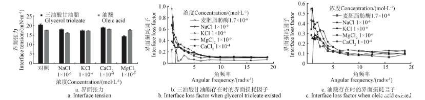 從圖8b和圖8c可以看出,三油酸甘油酯或油酸存在時,無機(jī)鹽對tanδ的影響規(guī)律性較差,出現(xiàn)上述情況的原因可能是因為無機(jī)鹽離子降低了麥胚LA在油水界面的溶解度,從而為三油酸甘油酯或油酸保留了更多的界面面積,有利于更多的三油酸甘油酯或油酸占據(jù)有效界面,以至于降低了底物或產(chǎn)物存在時的油水界面張力。