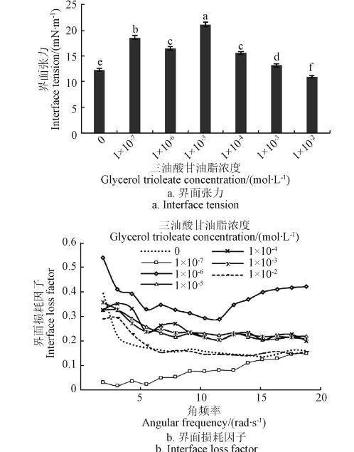三油酸甘油酯濃度對油水界面特性的影響見圖6。由圖6可見,當(dāng)麥胚LA濃度為1.70×10-6mol/L時,油水界面張力隨癸烷中三油酸甘油酯濃度的增加呈現(xiàn)先增加后減小的變化規(guī)律;當(dāng)三油酸甘油酯濃度介于10-5~10-3mol/L時,相同角頻率時界面損耗因子隨著濃度增加無明顯變化規(guī)律。此外,在試驗過程中,界面張力隨時間延長呈現(xiàn)一定下降趨勢,這說明麥胚LA與三油酸甘油酯的水解過程也會對界面張力產(chǎn)生一定影響。原因在于,在界面體系中,三油酸甘油酯可被麥胚LA水解,產(chǎn)生小分子的油酸等,三油酸甘油酯與麥胚LA組成的界面發(fā)生變化,進(jìn)而影響界面特性。