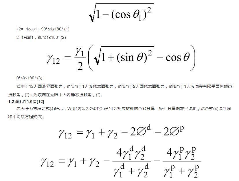 界面張力方程如式(4)所示,WU認為?d和?p分別為相應材料的色散分量、極性分量倒數(shù)平均和,結合式(4)得到調和平均法方程式(5)。