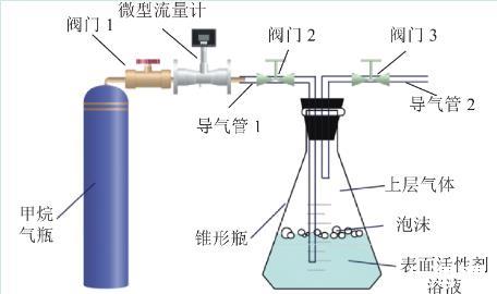 采取自主研發(fā)的泡沫對氣體緩釋效應試驗裝置進行試驗,試驗裝置如圖2所示。將250 mL表面活性劑溶液置于密閉錐形瓶,使用微型流量計控制甲烷氣體勻速向表面活性劑溶液中以300 mL/min速度通入50 mL氣體。試驗具體步驟如下: